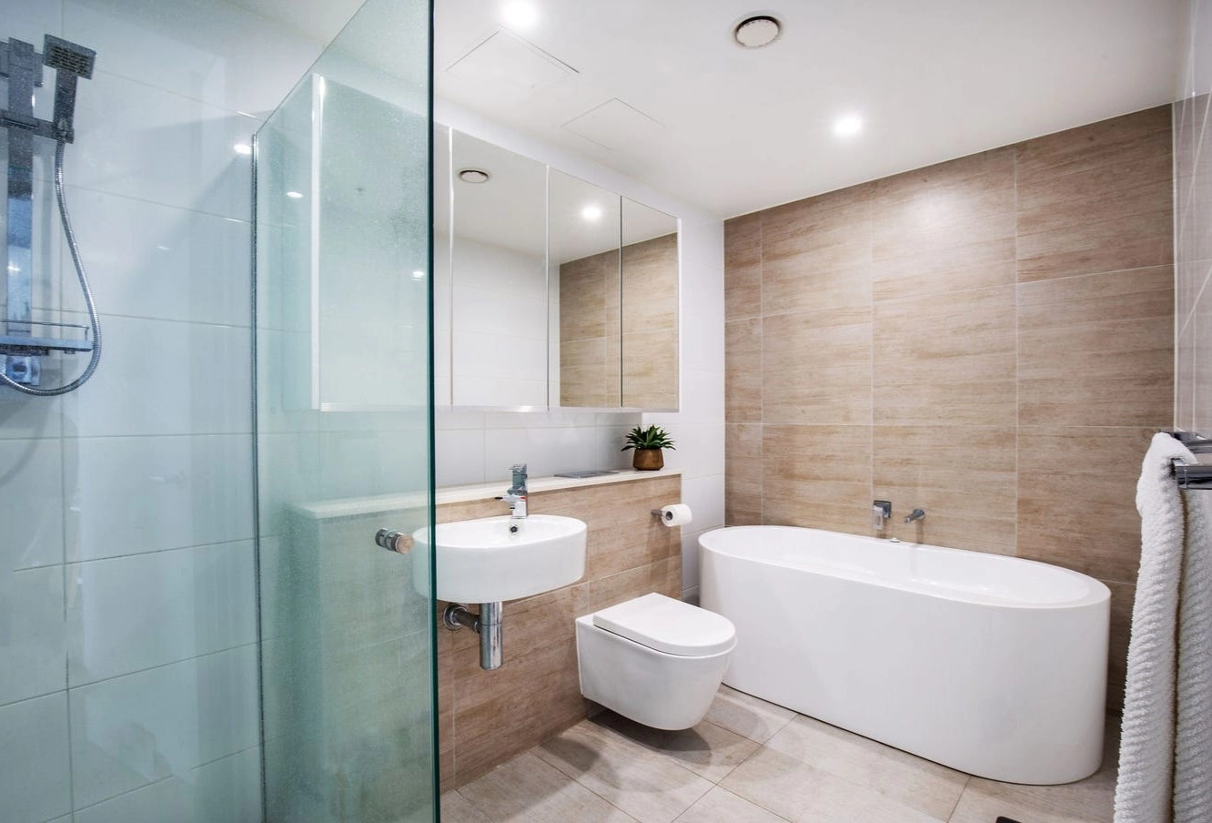 *Modern Bathroom: Featuring wall-mounted toilet and basin suites.